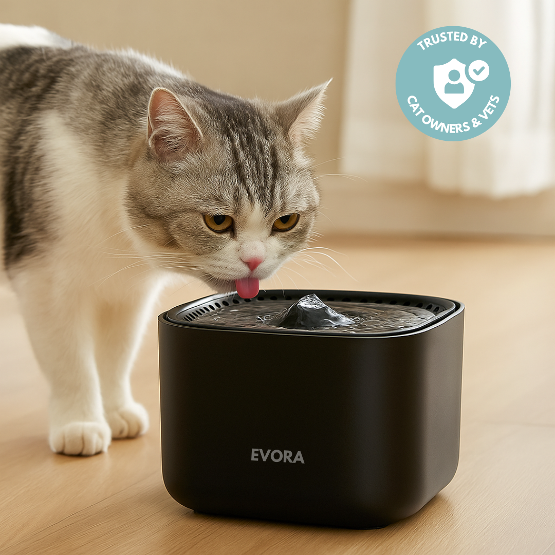 Still water in a bowl becomes a breeding ground for bacteria within hours. This can lead to slimy build-up, foul taste, and even health risks like urinary infections or kidney strain. The Evora Fountain keeps water moving, oxygenated, and filtered 24/7, so your cat always drinks fresh, clean water — not a bowl of germs.